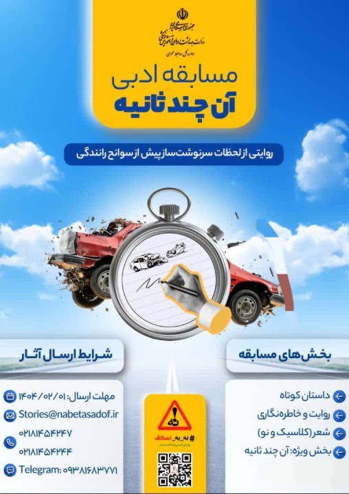 به همت ادارهکل روابط عمومی وزارت بهداشت و درمان و علوم پزشکی، مسابقه ادبی «آن چند ثانیه» با هدف روایت لحظات سرنوشتساز پیش از سوانح رانندگی برگزار میشود.