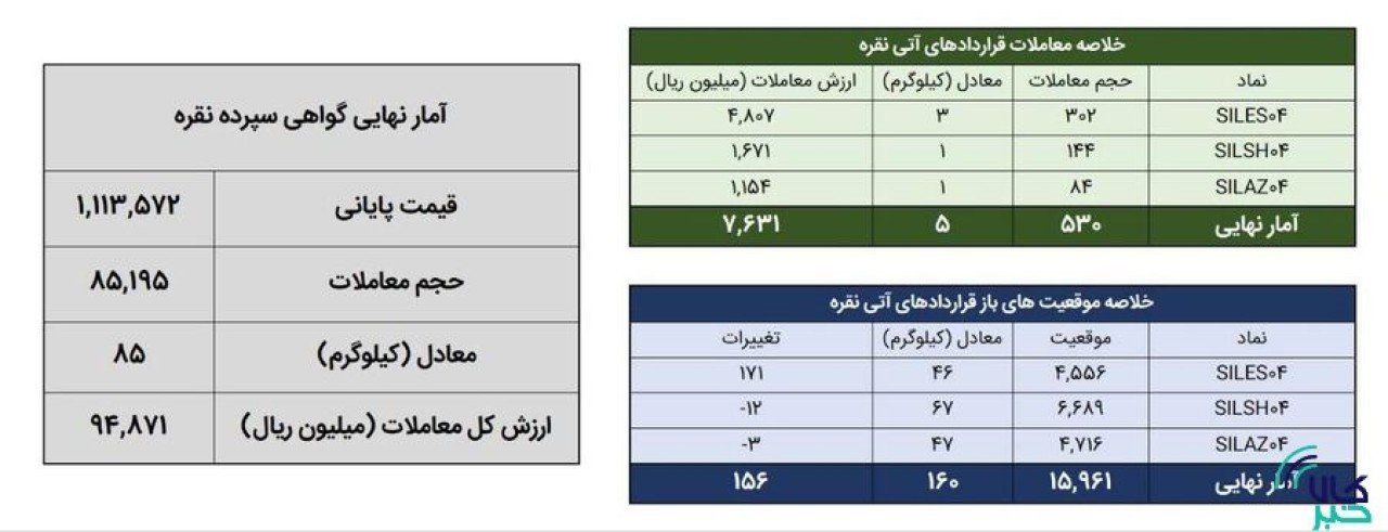 خلاصه معاملات بازار نقره در روز گذشته نشان می‌دهد که در این روز 85 هزار و 195 گواهی معادل 95 کیلوگرم شمش نقره به ارزش 9.5 میلیارد تومان دادوستد شد.