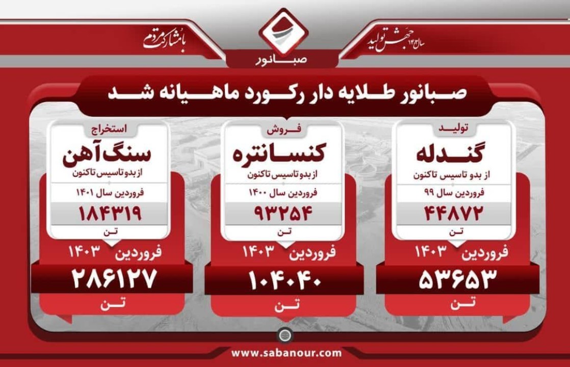 صبانور که یکی از شرکت های فعال در زمینه استخراج سنگ آهن و فروش کنسانتره آهن است، در فروردین ماه 1403 رکورد فروش ماهیانه کنسانتره و استخراج سنگآهن را نیز به دست آورد.
