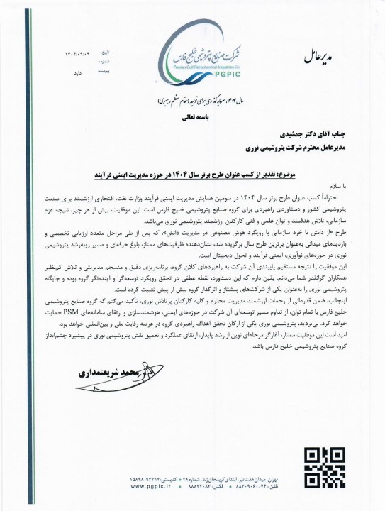 «کسب عنوان طرح برتر سال 1404 در سومین همایش مدیریت ایمنی فرایند وزارت نفت افتخاری ارزشمند برای صنعت پتروشیمی کشور و دستاوردی راهبردی برای گروه صنایع پتروشیمی خلیج فارس است. این موفقیت بیش از هر چیز نتیجه عزم سازمانی، تلاش هدفمند و توان علمی و فنی کارکنان ارزشمند پتروشیمی نوری می‌باشد.